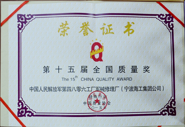 2015年,共有來(lái)自全國(guó)18個(gè)省、自治區(qū)、直轄市的70余家組織申報(bào)全國(guó)質(zhì)量獎(jiǎng),覆蓋國(guó)民經(jīng)濟(jì)26個(gè)行業(yè)大類,經(jīng)過(guò)嚴(yán)格的資格審查、資料評(píng)審、現(xiàn)場(chǎng)評(píng)審、工作委員會(huì)審議、網(wǎng)上公示、審定委員會(huì)審定等程序,評(píng)選出9家組織榮獲第十五屆全國(guó)質(zhì)量獎(jiǎng),工廠是今年唯一一家獲得“全國(guó)質(zhì)量獎(jiǎng)”的軍隊(duì)企業(yè)化工廠,也是東海方向及寧波地區(qū)第一家獲此殊榮的企業(yè),樹(shù)立了“海工”新標(biāo)桿,提升了“海工”品牌形象。
